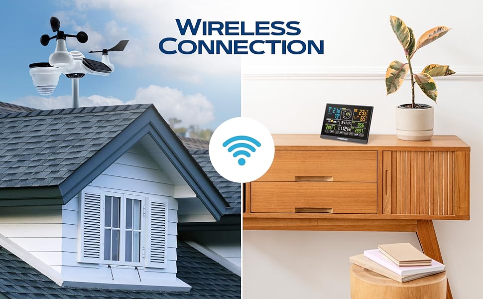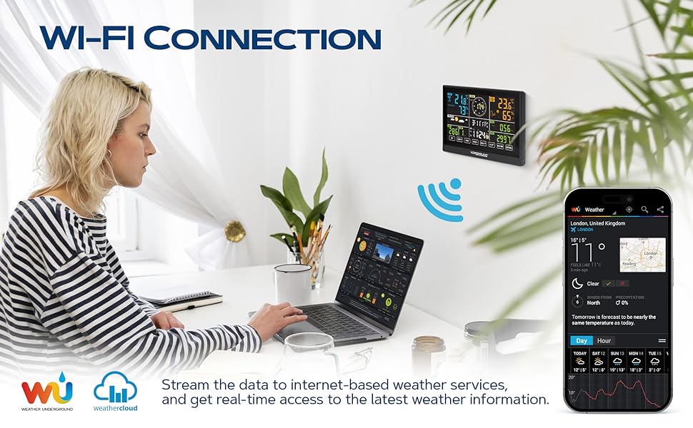 - APPLICATION WIFI + MÉTÉO SOUTERRAIN - Cela permet un accès à distance, ce qui signifie que vous pourrez avoir accès aux conditions météorologiques en temps réel, aux données historiques et aux alertes sur votre téléphone. Vous pouvez également partager vos données à l'échelle mondiale en transférant vos données sur le réseau Weather Underground.