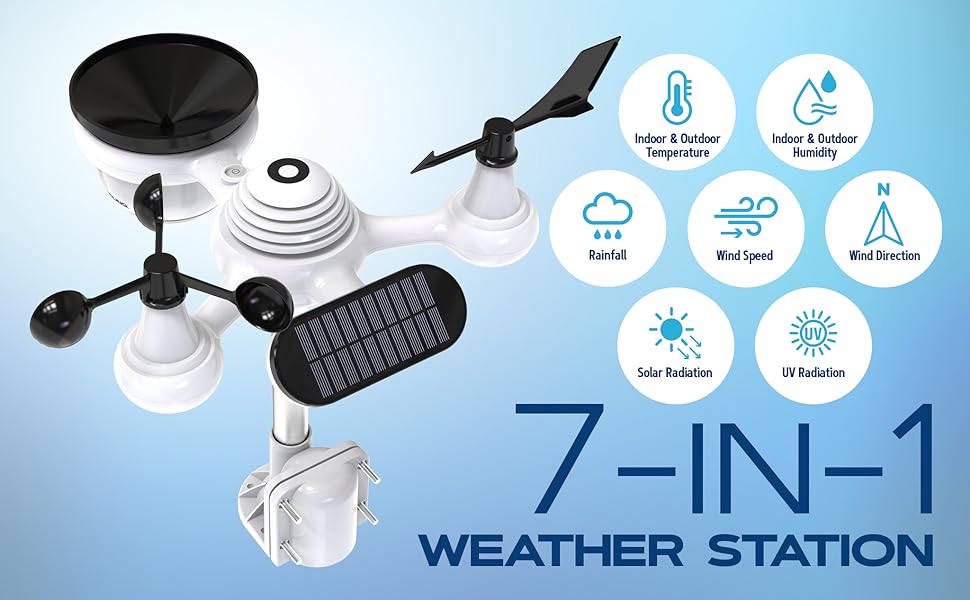 - PRÉVISIONS MÉTÉO PRÉCISES - Notre station météo SMART comprend un pluviomètre de haute spécification et des débitmètres numériques pour mesurer les précipitations équivalentes aux liquides. Bénéficiez d'une surveillance météo en temps réel et d'alertes immédiates en cas d'urgence. CAPTEUR EXTÉRIEUR 7 EN 1 - Notre capteur 7 en 1 comprend la température, l'humidité, la vitesse du vent, la direction du vent, les précipitations, les UV et notre DERNIER rayonnement solaire
